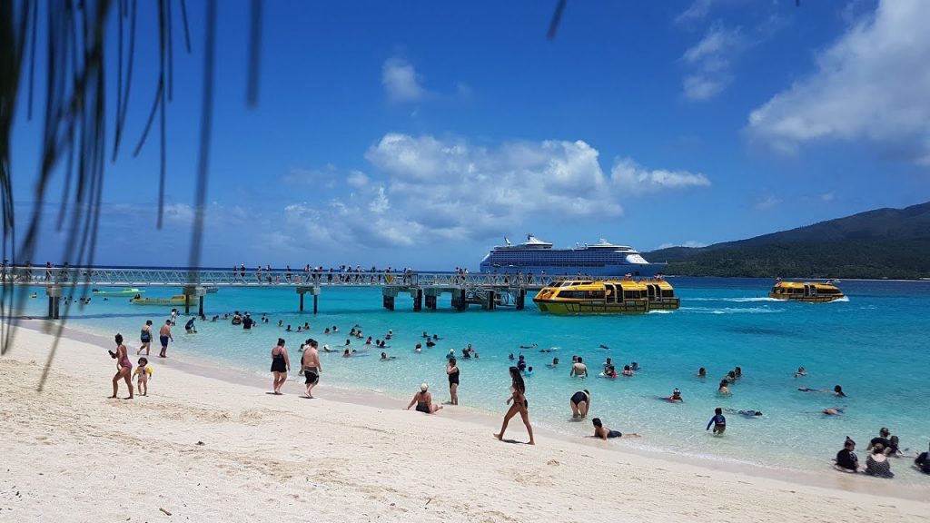 The Mystery Island receives between 15 to 20 cruise ships a year with thousands of tourists flooding the island per trip. In contrast to the sad history of the blackbirder, cruise lines have worked hard with the locals and provided a boat to help them ferry supplies and develop activities for the guests and earn extra income for their communities. But maintaining the island in its pristine condition is also part of the job. Mystery Island was in the 1950s made up of two islands known respectively as the islands of Navinacas and Ningec raised from very large coral base covering more than a square kilometer of reef. It is believed that was due to the closing of the Nitkanohou passage on the western side of the large reef that stopped the tide from its continuous flow between the two islets thus encouraging the sand build up which eventually bridged the two islets together. Traditionally, the two islands and their reefs were used as a common fishing ground for the people of Aneityum Island. Due to intensive harvesting of shells and fish for home consumption and income generation, these once abundant resources became very scarce that the conservation project and the community decided to protect the area to replenish the resources and to attract more tourists to the area. One of the conservation efforts, called The Tourist Project, is directly responsible for the Mystery Island Marine Protected Area. The Tourist Project now operates a bungalow on the island, a marketplace, a boat that freely ferries people to the island. They employ two full time workers. One is responsible for the general maintenance of the bungalows and the other is responsible for the daily feeding of fish in the Marine Protected Area. They also have a team of security to ensure that people do not remove resources from the MPA and to provide security for tourists coming especially on cruise ships.
